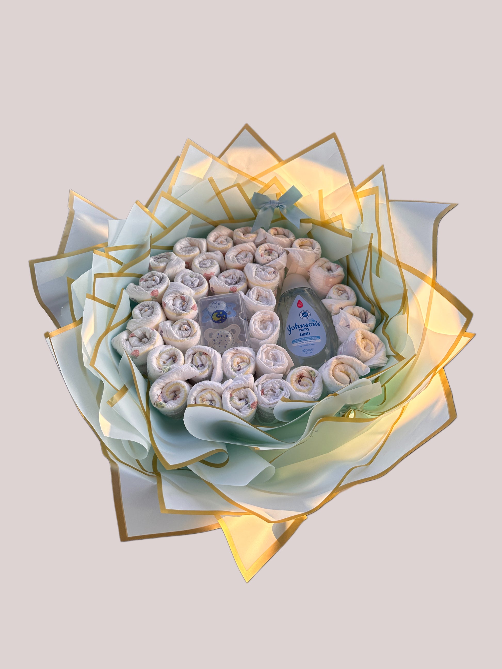 Hver bleiebukett lages for hånd og inneholder kun nye, ubrukte og hygieniske produkter. Bleiene er rullet og formet som blomster, elegant pakket inn i blå nyanser og levert ferdig gaveklar.